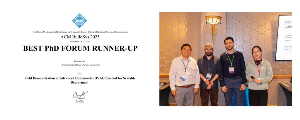 - November, 2025 – Arash wins runner-up in the Best PhD Forum competition for his presentation on “Field Demonstration of Advanced Commercial HVAC Control for Scalable Deployment” at ACM BuildSys! (The Association for Computing Machinery’s International Conference on Systems for Energy-Efficient Buildings, Cities, and Transportation.)
